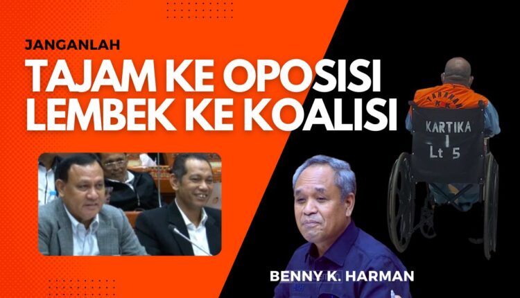 Benny yang mengaku meminjam istilah dari Arsul Sani, anggota Komisi III dari PPP, jangan KPK bertindak ”tajam ke oposisi, tapi lembek ke koalisi.”
