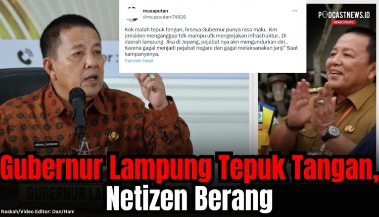 Kini netizen kembali dibuat geram dengan sikap Arinal Djunaidi yang ikut tepuk tangan dan mengucap syukur saat Presiden Jokowi mengambil alih perbaikan jalan rusak di Lampung. Salah satu kegeraman netizen tersebut terlihat dalam status unggahan akaun Twitter @BrendyNababan (klik) yang menuliskan narasi: Inilah contoh manusia nggak punya rasa malu, tepuk tangan pula dia. Harusnya dia malu dan segan dengan Presiden karna kegagalannya sebagai gubernur Lampung.