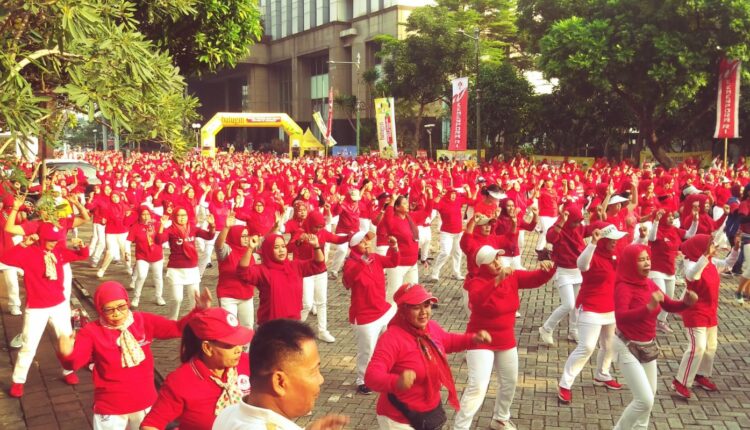 PODCASTNEWS.ID – Ribuan emak-amak berseragam merah putih memenuhi halaman Kantor Wali Kota Jakarta Barat Minggu (28/5/2023). Mereka mengikuti rangkaian senam dalam acara Senam Gembira Bersama Kemenpora sejak pagi hingga tengah hari.