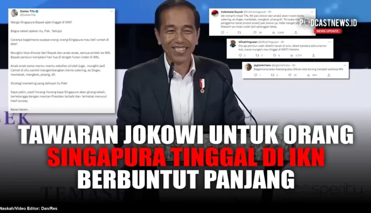 PODCASTNEWS.ID – Tawaran Presiden Jokowi untuk orang Singapura agar tinggal di IKN Nusantara berbuntut panjang di media sosial. Sejumlah kalangan menanggapi serius kendati Jokowi menyampaikannya terkesan bercanda dan mengundang gelak tawa hadirin dalam pidatonya di Ecosperity Week 2023 Singapura, Rabu (7/6/2023).