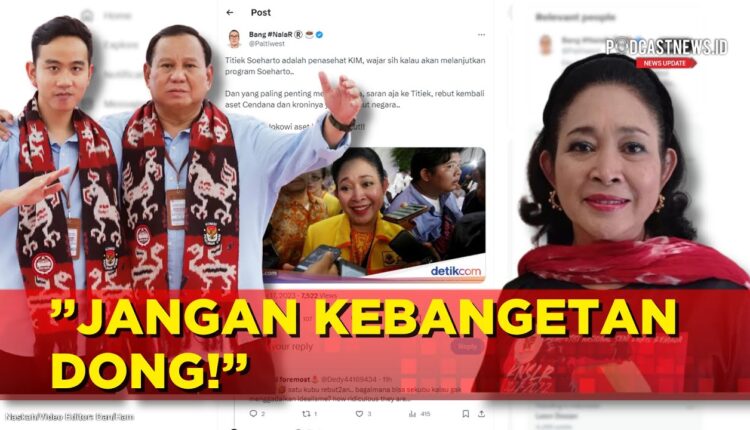 Isu tersebut salah satunya diunggah di akun Twitter Paltiwest yang menulis status: Titiek Soeharto adalah penasehat KIM, wajar sih kalau akan melanjutkan program Soeharto. Dan yang paling penting menurut saya, saran aja ke Titiek, rebut kembali aset Cendana dan kroninya yang direbut negara. Keterlaluan Jokowi, aset kalian direbut!