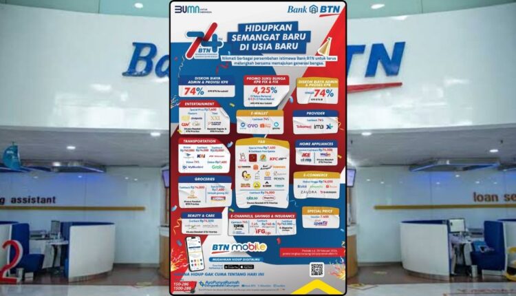 PODCASTNEWS.ID – PT Bank Tabungan Negara (Persero) Tbk (BTN) akan memasuki usia ke-74 tahun pada 9 Februari 2024 mendatang. Untuk memeriahkan gelaran HUT ke-74 tahun tersebut, BTN menggelontorkan berbagai promo diskon serba 74 dibanyak merchant di seluruh Indonesia.